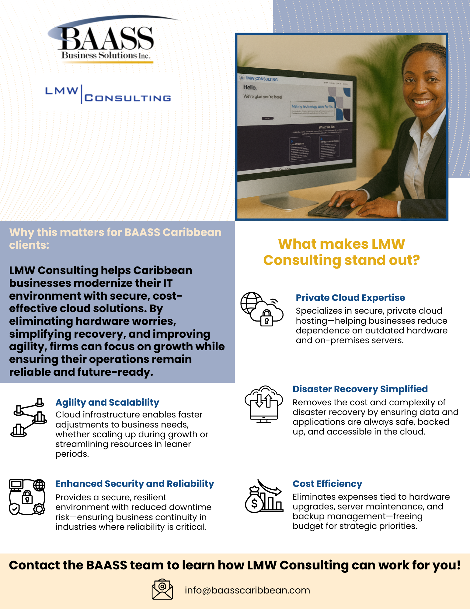 LMW Consulting is a private cloud hosting partner. If you're tired of your hardware always being outdated and worry about the time and cost of disaster recovery, LMW can move your business to the cloud and make your life easier. Moving to the cloud will make your business better, more nimble, efficient, and secure. Even better, you'll no longer have to maintain server hardware, backups or plan for costly upgrades.